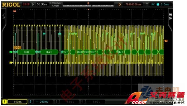 經依次驗證后發現以上各項均無問題,那么,只可能是在通信過程中發生了錯誤。但是,在參考手冊中卻沒有找到關于68013A與EEPROM通信的詳細描述。為獲取兩者間在初始通信階段的詳細數據,使用RIGOL公司的DS6104示波器來捕獲初始階段的通信數據。