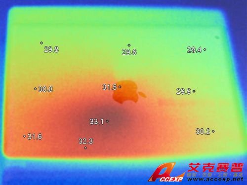 通過對比可以看到,新iPad的背部發(fā)熱的確要比iPad 2高。iPad 2最熱處為33.1°C,新iPad最熱處為34.1°C,其余對應(yīng)部位新iPad也比iPad高出1°C左右。