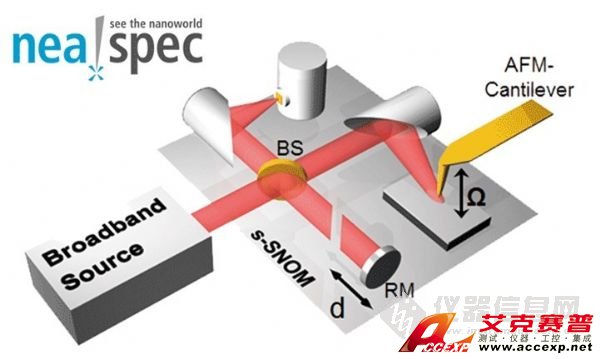 2013年,Neaspec公司推出了nano-FTIR光譜儀,利用其獨(dú)有的散射型近場(chǎng)光學(xué)技術(shù)發(fā)展出來(lái)的納米傅里葉變換紅外光譜技術(shù),使得納米級(jí)化學(xué)鑒定和成像成為可能。nano-FTIR光譜儀的工作原理如圖3所示,將一束寬帶中紅外激光耦合進(jìn)入近場(chǎng)顯微鏡(NeaSNOM),對(duì)原子力顯微鏡(AFM)針尖進(jìn)行照明, 通過(guò)一套包含分束器、參考鏡和探測(cè)器在內(nèi)的傅里葉變換光譜儀對(duì)反向散射光分析,即可獲得針尖下方20 nm區(qū)域內(nèi)的紅外光譜,使得紅外光譜成像系統(tǒng)的的空間分辨率突破了微米的界限。該類(lèi)型儀器綜合了AFM的高空間分辨率,和FTIR的高化學(xué)敏感度,實(shí)現(xiàn)了對(duì)有機(jī)、無(wú)機(jī)材料的納米級(jí)化學(xué)分辨。