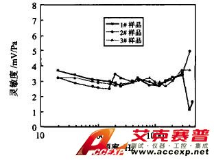 實(shí)驗(yàn)樣品采用北京信息工程學(xué)院研制的YLC-A型壓電式微壓傳感器,樣品數(shù)為3只。將傳感器安裝在測(cè)試腔蓋樣品架上,輸出端與腔蓋上的樣品輸出引線連接,扣緊腔蓋,按圖1所示連接系統(tǒng)。由于傳感器內(nèi)裝前置放大器,需提供直流電源工作,電源加在腔蓋上被測(cè)傳感器輸出端。調(diào)節(jié)信號(hào)發(fā)生器產(chǎn)生正弦信號(hào),信號(hào)幅度不宜過大,以避免傳感器輸出失真。選取多個(gè)信號(hào)頻率,分別測(cè)量每個(gè)頻率點(diǎn)兩傳感器的輸出電壓,在1kHz處示波器上的標(biāo)準(zhǔn)傳感器波形(1)的峰-峰值電壓為145.5mV;被測(cè)傳感器波形(2)的峰峰值電壓為5.85V。將V標(biāo)和V測(cè)代入式(1)算出被測(cè)傳感器的靈敏度。根據(jù)計(jì)算結(jié)果繪制傳感器的靈敏度隨頻率變化曲線,如圖2所示,從而得到傳感器的頻率響應(yīng)范圍。