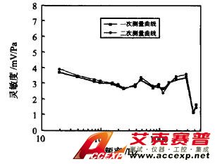 為檢測(cè)測(cè)量系統(tǒng)的重復(fù)性,實(shí)驗(yàn)對(duì)1#傳感器進(jìn)行了重復(fù)測(cè)量,圖3示出2次測(cè)量的靈敏度變化曲線。