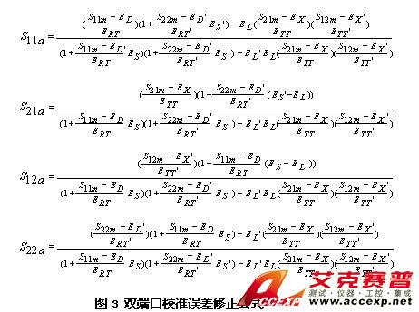 以上12項(xiàng)系統(tǒng)誤差,通過雙端口校準(zhǔn)可以獲得。校準(zhǔn)后,對被測件進(jìn)行測量,測量過程得到四個測量S參數(shù)S11m,S21m,S12m和S22m。基于圖3所示的四個雙端口誤差修正公式,消除12項(xiàng)系統(tǒng)誤差,最終計(jì)算出實(shí)際需要的被測件的四個S參數(shù)S11a,S21a,S12a和S22a。