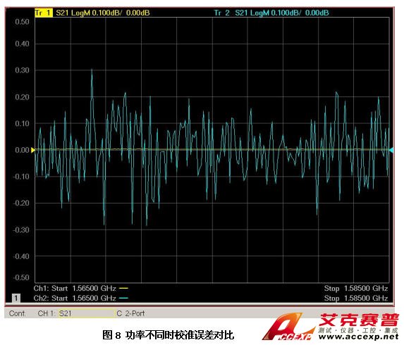 完成雙端口校準(zhǔn)后,直通連接。功率為-60dBm與-20dBm的校準(zhǔn)誤差對比如圖8所示。