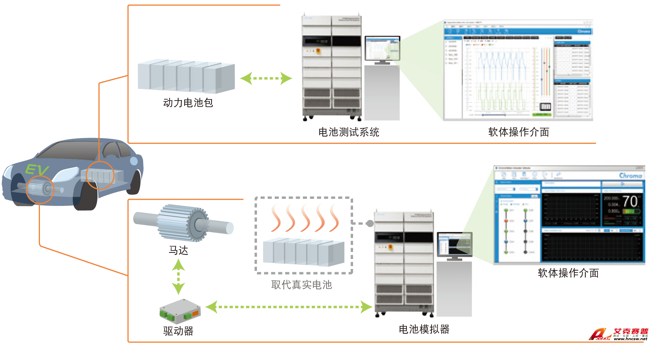 艾克賽普 能源回收式電池模組測試系統解決方案17040是專為高功率二次電池組測試而開發的高精密充放電設備,具有能源回收功能,可節省放電過程所消耗的大量電能,即使動態充放電,也能確保電網端維持穩定,不致因諧波污染影響其他設備。并將電池組放電產生的電能回收到電網再利用,解決傳統的設備放電能量虛耗,以及空間熱處理不易的問題,符合環保需求。