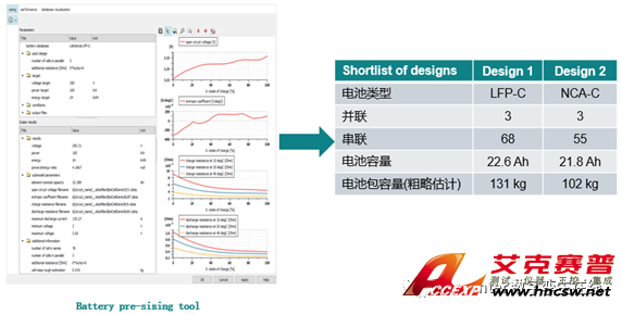 Amesim 在電池庫的開發(fā)過程中,提供了一系列完成標(biāo)定的的不同類型(LFP-C/NCA/NMC 等)的電池模型和超級(jí)電容模型,早期開發(fā)中缺少詳細(xì)電池試驗(yàn)和參數(shù)時(shí),可用Amesim提供的電池預(yù)設(shè)計(jì)工具從簡單的宏觀性能要求參數(shù)逆向生成真實(shí)模型所需要的電池參數(shù),包括OCV、內(nèi)阻和極化等參數(shù),完成動(dòng)力電池基本選型。