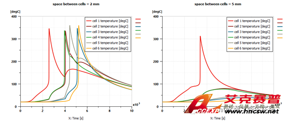 上述模型中,當(dāng)單體間距2mm時(shí),從單體1開始,每個(gè)單體依次發(fā)生熱失控;當(dāng)單體間距5mm時(shí),只有單體1發(fā)生熱失控,其他單體只是溫度增加,未達(dá)到熱失控引發(fā)溫度。