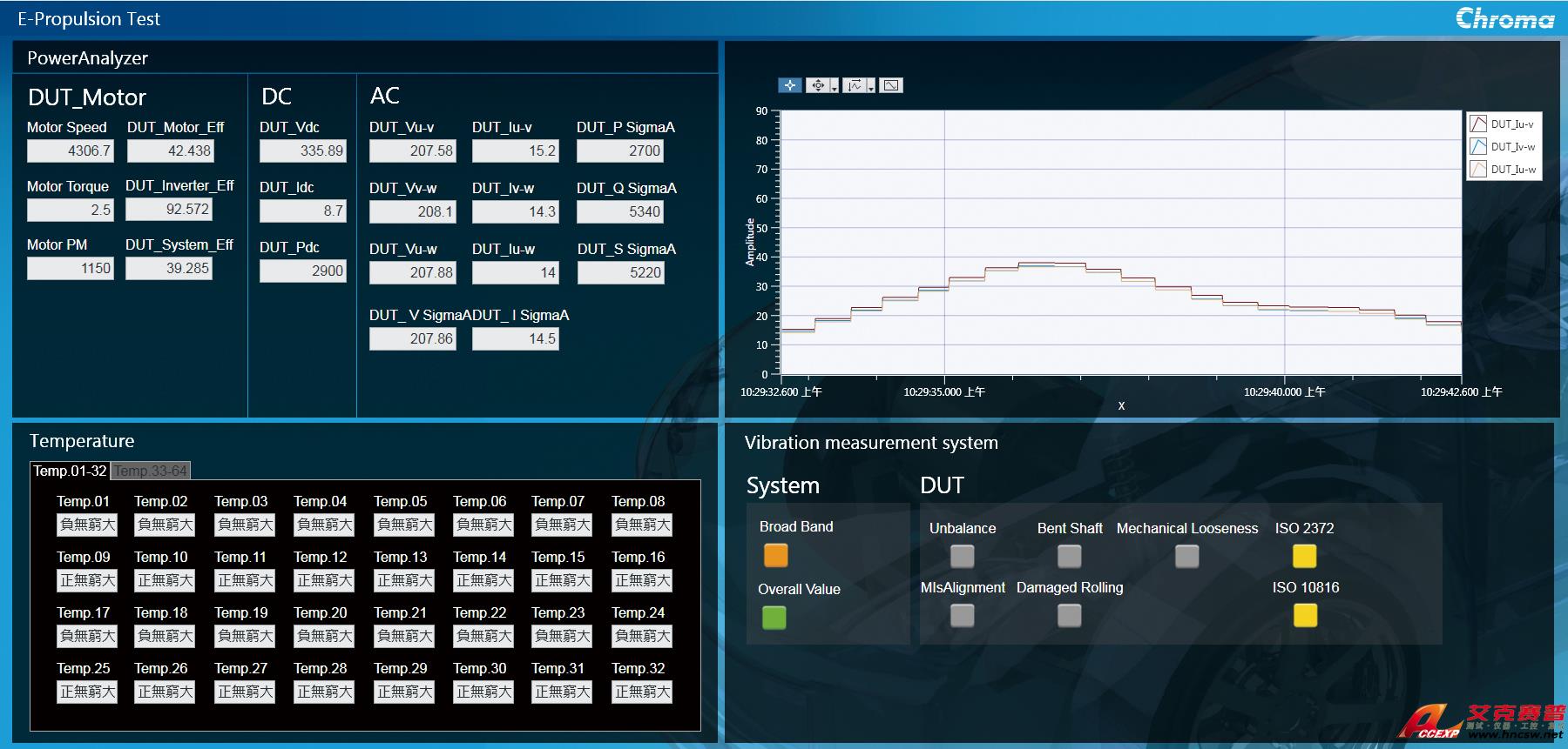 系統具有過流保護、過壓保護、欠壓保護、短路保護、電源缺相識別、系統溫度監控等保護機制及過載響應警告功能。其E-Propulsion Test 系統控制軟體具有載入DBC、關聯DBC、手動控制與監測資料等;測試介面可以實時顯示測試的瞬時值(電壓、電流、轉速、轉矩、輸入功率、輸出功率、效率、溫度等),并可按一定的時間(可設定) 采集數據。同時在測試過程中曲線繪制,產出報表,包含測試過程的曲線圖 (電壓、電流、轉速、轉矩、輸入功率、輸出功率、效率、溫度等)。系統采開放式軟體管理架構,具有快速連結試驗室相關測試及安全監控之設備能力,并配置振動監控模組,同步監控臺架與試驗件運行狀態,借以完成一體化實驗室整合及管理。