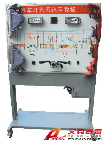前大燈、前角燈、前霧燈、側燈、燈光開關總成、變光開關總成、尾燈、牌照燈、后霧燈、剎車燈開關、倒車燈開關、故障設置系統、電源、彩色原理與結構圖、控制面板、可移動臺架、使用說明書及實訓指導書等。