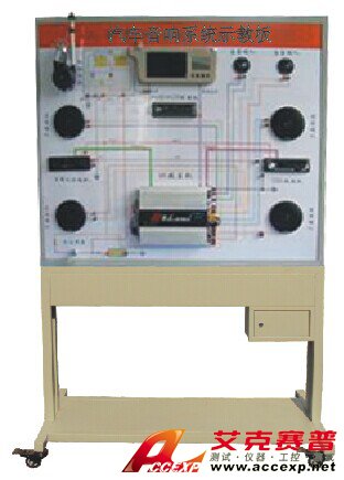 音響(含收音機、DVD機、CD/VCD機、卡帶式收錄機)總成、左前車門揚聲器、右前車門揚聲器、左后車門揚聲器、右后車門揚聲器、汽車功放、低音炮、音響功放、自動天線、故障設置系統、電源、彩色原理與結構圖、控制面板、可移動臺架、使用說明書及任務驅動式實訓指導書等。