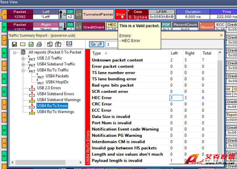 Teledyne LeCroy Voyager可以檢測并標記實際的USB4,USB 3.2和PD協(xié)議錯誤。在較低的層,將自動檢查訓(xùn)練序列,SCR內(nèi)容和CRC值是否存在錯誤。驗證了配置數(shù)據(jù)包時序以及許多USB 3.2 / USB4邏輯層時序要求。