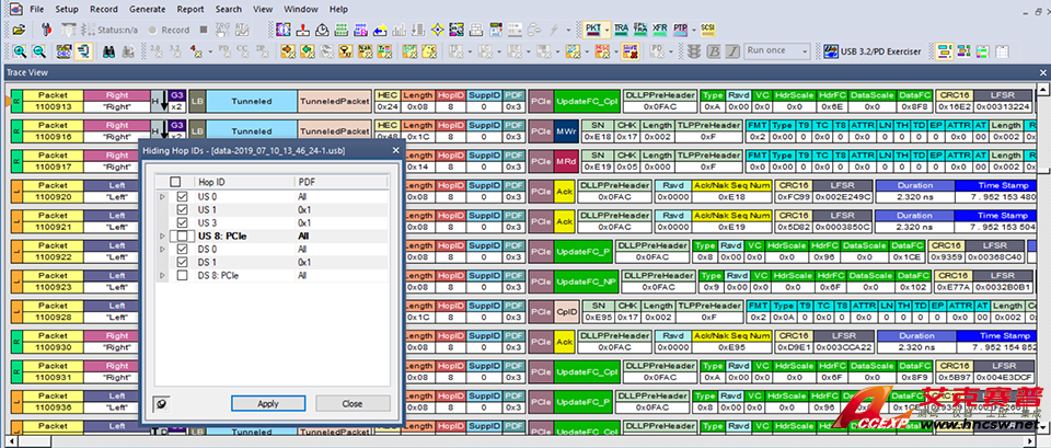 Voyager利用了傳奇的CATC Trace –行業(yè)實際的標準顯示,可以在單個視圖中顯示所有帶有標簽和交錯的數(shù)據(jù)包。邏輯USB4和邊帶通道的流量可以單獨進行跟蹤過濾,搜索或?qū)С觥?梢詳U展和折疊傳輸級別,以顯示包括所有有序集和控制數(shù)據(jù)包的邏輯層。在排隊時,它將記錄并顯示所有寄存器的讀寫,以提供路由器和路徑配置空間的清晰畫面。HopID窗口允許基于Hopid和協(xié)議定義的功能(PDF)精確隱藏流量。隔離特定路徑上的流量可為網(wǎng)絡(luò)中的每個PCIe,USB或DP適配器提供完整配置順序的連貫圖。