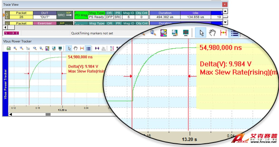 Voyager M4x Power Tracker選項以時間線格式監(jiān)視并以圖形方式顯示vBus電源和電流。電壓被同步以跟蹤事件,從而允許用戶驗證協(xié)議和電氣層的電源狀態(tài)轉(zhuǎn)換。為CC和VCONN提供了獨立的功率圖,從而易于調(diào)試邏輯C型狀態(tài)轉(zhuǎn)換。