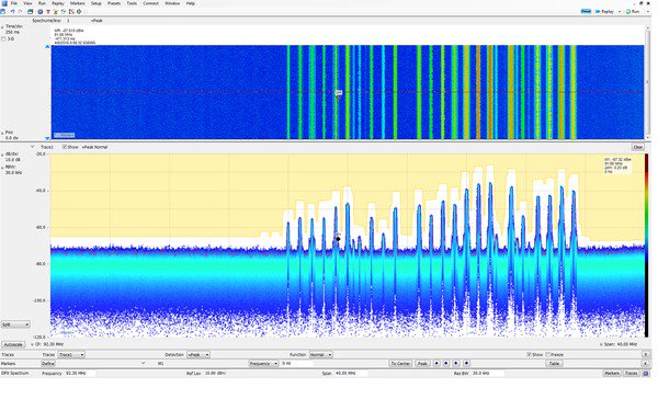 看到您以前從未看到的細(xì)節(jié):RSA306B 的 40?MHz 實時帶寬與 SignalVu-PC 的處理能力相結(jié)合,為您顯示每一個信號,在使用高性能電腦時可顯示最短持續(xù)時間為 27?μs 的信號。下圖顯示了WLAN 傳輸( 綠色和橙色),在屏幕中重復(fù)出現(xiàn)的窄信號是一只藍(lán)牙接入探頭。三維頻譜圖( 屏幕上方部分) 在時間上把這些信號清楚地分開,顯示任何信號碰撞。