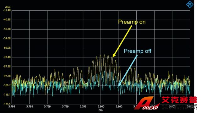 R&S Spectrum Rider 的 DANL 低至 –146 dBm(典型值)。DANL 較低,表明分析儀可捕獲微弱信號。開啟前置放大器(選件),將靈敏度進一步提升到低至 –162 dBm(20 MHz 至 3 GHz)。前置放大器選件: