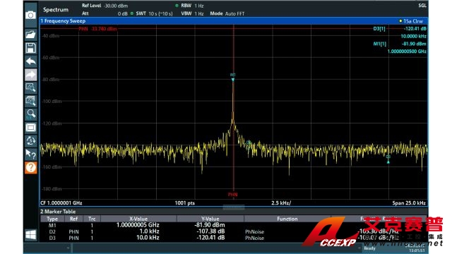 R&S FPL1000 可與高級(jí)別分析儀相提并論,它在 10 kHz 偏置(1 GHz 載波)時(shí)的相位噪聲典型值為 –108 dBc (1 Hz),三階互調(diào)截取點(diǎn)典型值為 +20 dBm,分辨率帶寬為 1 Hz 至 10 MHz,顯示平均噪聲電平典型值為 –163 dBm。因此,它非常適合在實(shí)驗(yàn)室、生產(chǎn)以及維修任務(wù)中使用。