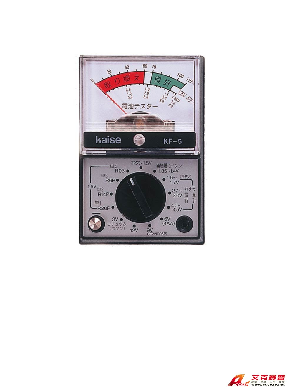 簡介:日本凱世KAISE KF-5指針式模擬萬用表詳細介紹 指針式模擬萬用表KF-5 日本凱世KAISE KF-5指針式模擬萬用表的參數: 產品說明: 電池測試儀表 產品參數: KF-5 電池種類 標準負荷 1.5V紐扣型 2mA 1.5V單4R...