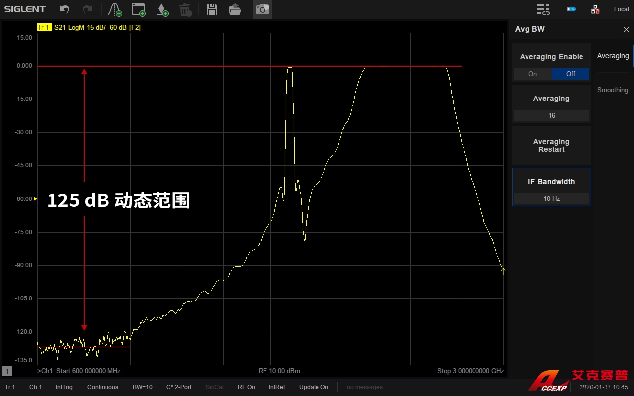 系統動態范圍是VNA一個非常重要的指標,它是VNA源的最大輸出功率與測試端口本底噪聲的差值。SNA5022A 擁有最大125 dB的動態范圍,可適用于對動態范圍要求比較高的測試場景,比如同時測量濾波器的通帶和帶外抑制性能。