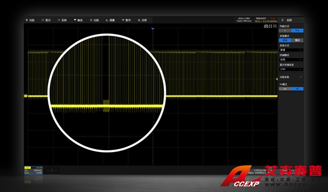 根據奈奎斯特采樣定律,為了保證采樣后的數字信號能完整復原真實信號的信息,一般實際應用中需要保證采樣率為信號最高頻率的2.56~4倍。SDS7204A H10示波器的采樣率最高達20 GSa/s,是最高帶寬的5倍,能完美避免因采樣率不足而導致的信號失真。再搭配上最大1 Gpts/通道的長存儲深度,在長時間捕獲波形的同時,依然能使用更高的采樣率高保真捕獲波形,充分發揮4GHz帶寬性能。