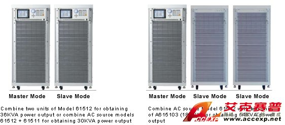 61511/61512/61611/61612交流供應器可經由(Master-Slave)并聯輸出模式以達成使用者對于高功率的需求。例如:連接5臺18KVA交流供應器在并聯模式下可實現90KVA的輸出功率。使用者還可利用專為并聯模式所開發的18KVA并聯專用機為有效替代slave單機的解決方案。請參考以下為61511/61512/61611/61612及A615103在并聯模式下的配置圖。