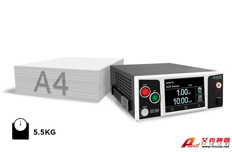 EST-300系列新一代耐壓測試儀擁有先進的緊密尺寸設計,并同時保有其強大的性能。不僅將交流耐壓(ACW)、直流耐壓(DCW)和絕緣阻抗(IR)功能整合到單一的機臺,其尺寸與重量的輕便優勢利于任何空間的擺設配置。此外,透過儀器互連技術設計,更可以擴充功能連接接地阻抗(GB)測試儀,從而形成更完整的測試系統,提供更全面的安規測試解決方案。